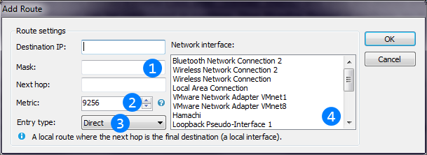 List is used to select the local interface through which the next hop of this route should be reached.Context menu for each mapping entry allows to delete it.
