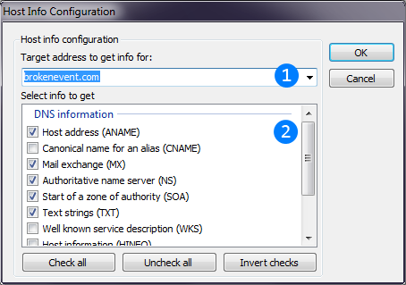List of information items to retrieve. There are two groups of items: DNS records and WhoIs. Meanings of all types of DNS records are described in