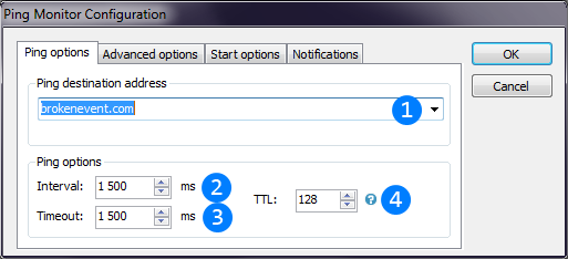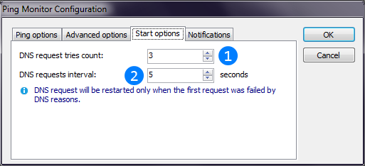 Warning: this value can only be changed when thread starts and cannot be changed while it is running.If AntiFreeze.NET starts on Windows start, it can start earlier than network appear, so internet connection will not be present when Ping Monitor starts. In this case Ping Monitor could not reslove IP address of the ping target. Ping Monitor will retry DNS requests until hostname will be found or count of tries exceed. "Start options" tab is used to configure this startup behavior: