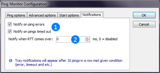Checkboxes enables tray notifications when 10 pings in a row become lost or are returned with network error.