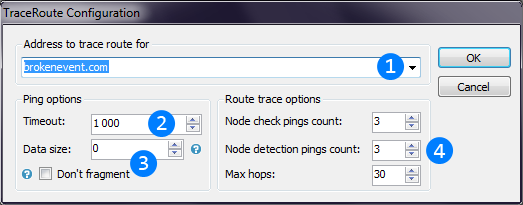 route nodes. Data size is the number of bytes to send with each ping. Don't fragment flag disables packet fragmentation, so if the packet size exceeds MTU of one of the nodes,