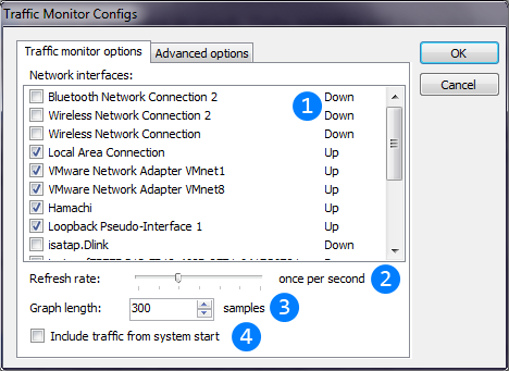 Refresh interval of Traffic monitor. It will retrieve traffic snapshots every selected intervals of time. Smaller intervals give more precise statistics (and more frequent samples on graph),