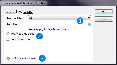 but notifiy only for TCP. Port filter field uses the same rules as everywhere else. You can set enumaration of ports or port ranges separating them by comma ("80", "80, 8080", "80, 200-250" and etc.).